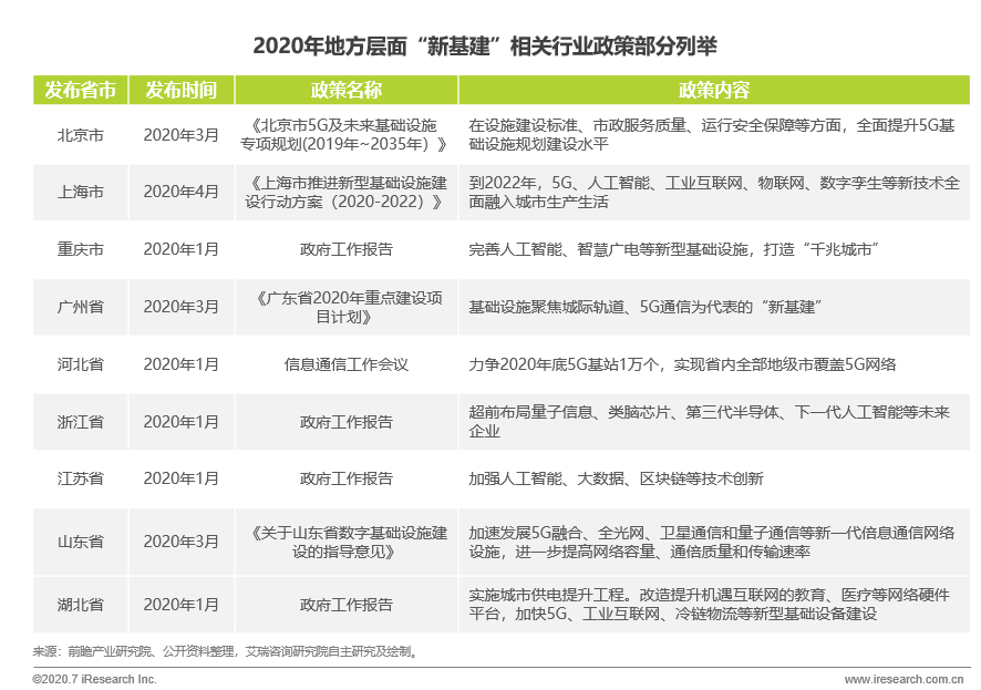 同时,自“新基建”提出以来,近几个月各个地方政府频繁出台相关政策,大力扶植5G、人工智能、大数据、通信等产业发展,大力推进城市基础设施升级建设。